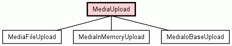 Describes a media object to upload. Base class that defines the interface of MediaUpload subclasses. Note that subclasses of MediaUpload may allow you to control the chunksize when upload a media object. It is important to keep the size of the chunk as large as possible to keep the upload efficient. Other factors may influence the size of the chunk you use, particularly if you are working in an environment where individual HTTP requests may have a hardcoded time limit, such as under certain classes of requests under Google App Engine.